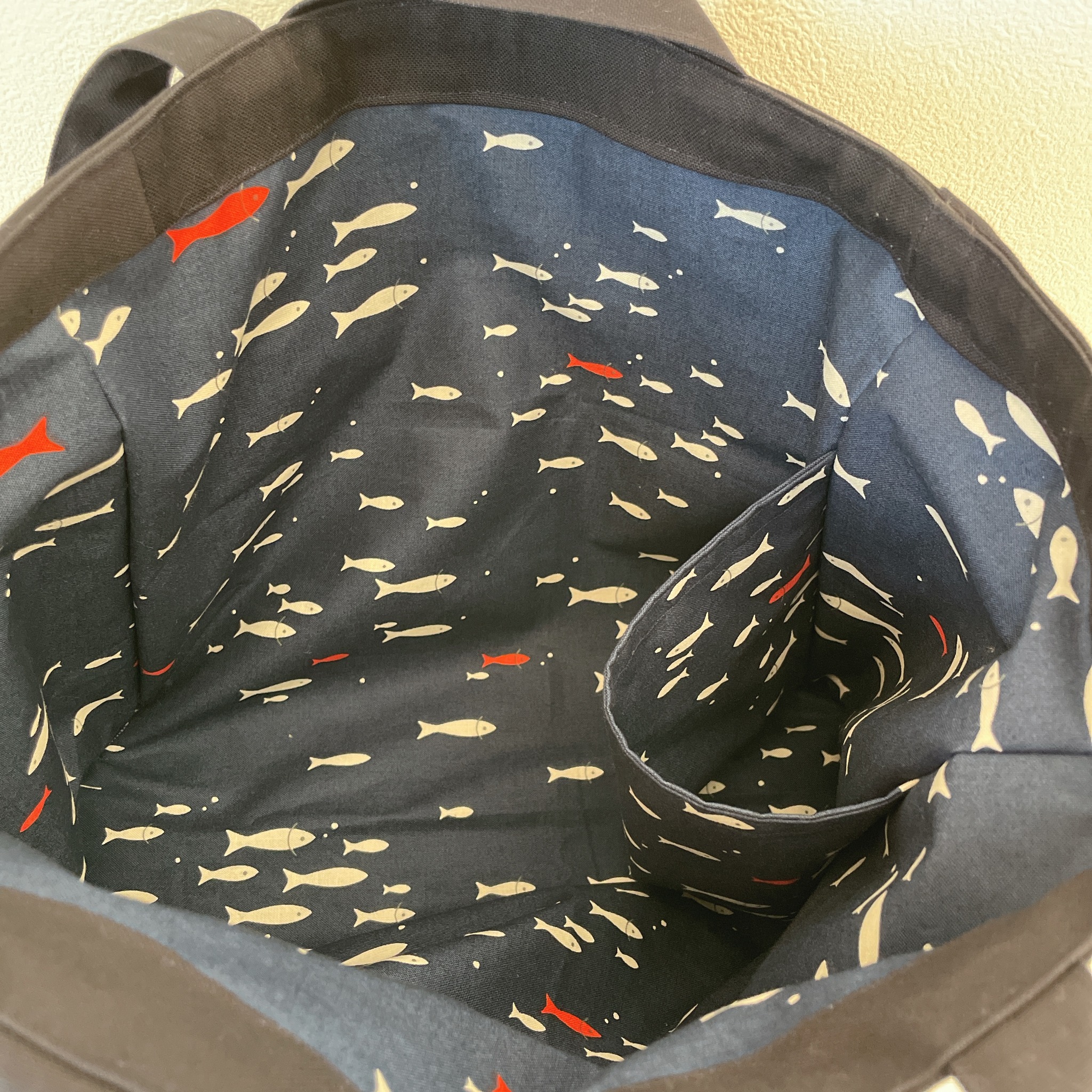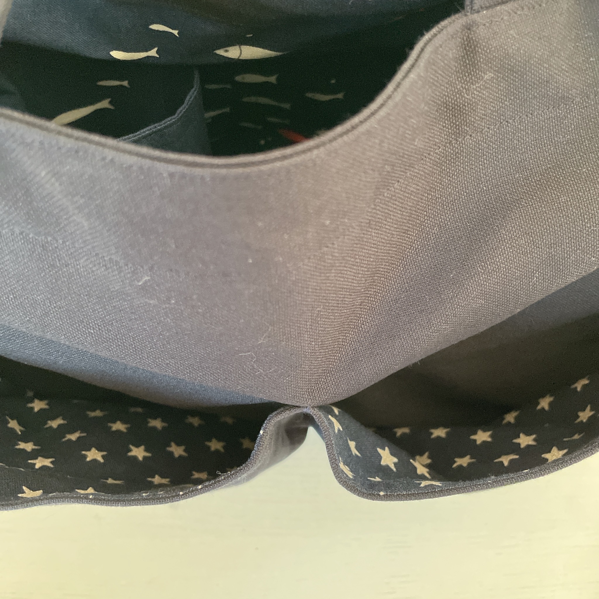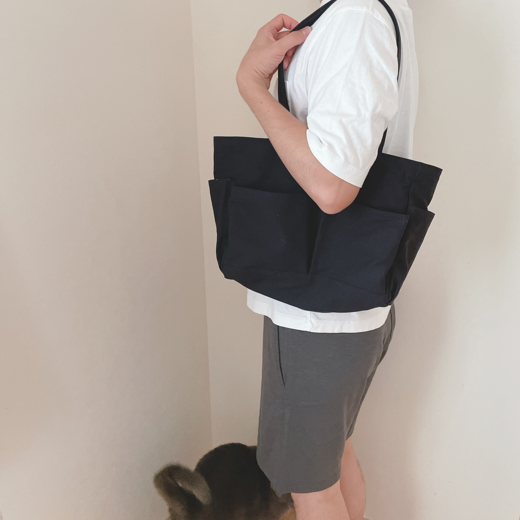 お出かけグッズカバンの口布をなくして、肩にかけられるようにしました。