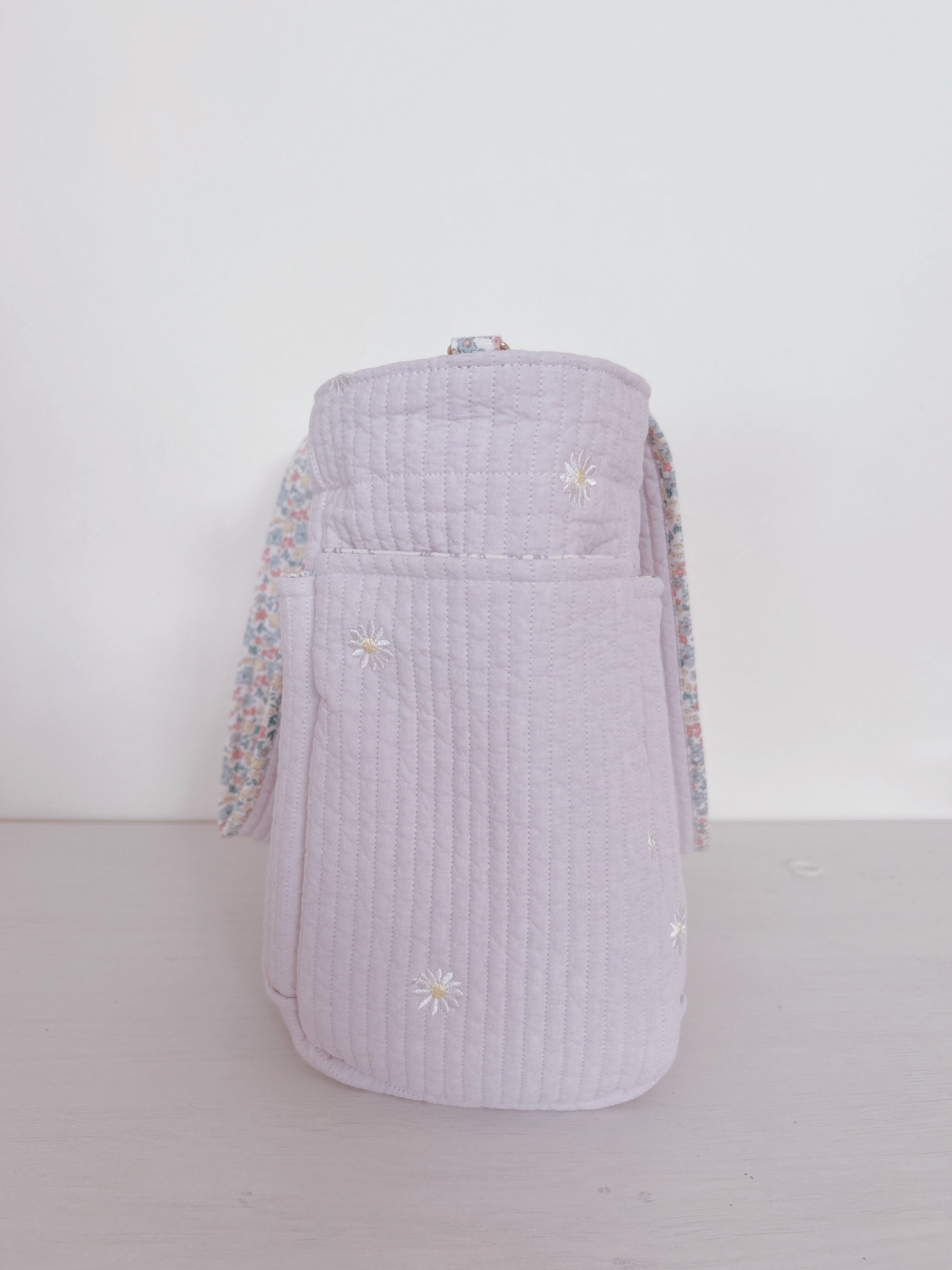 外側は、ライラックカラーのヌビ生地に白いマーガレット刺繍をあしらった、