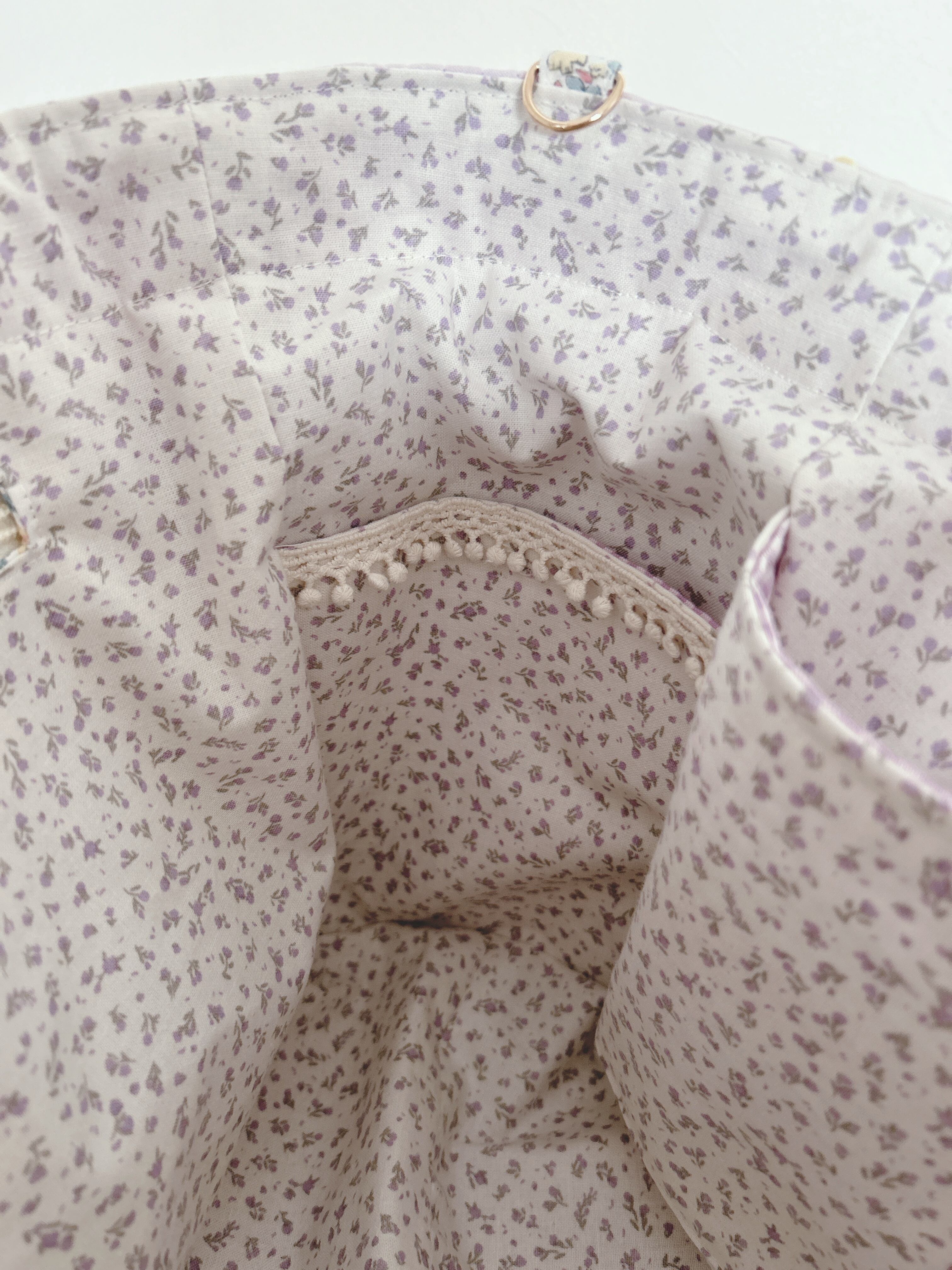 内側には、紫の小花が散りばめられた防水コットン生地を使用。