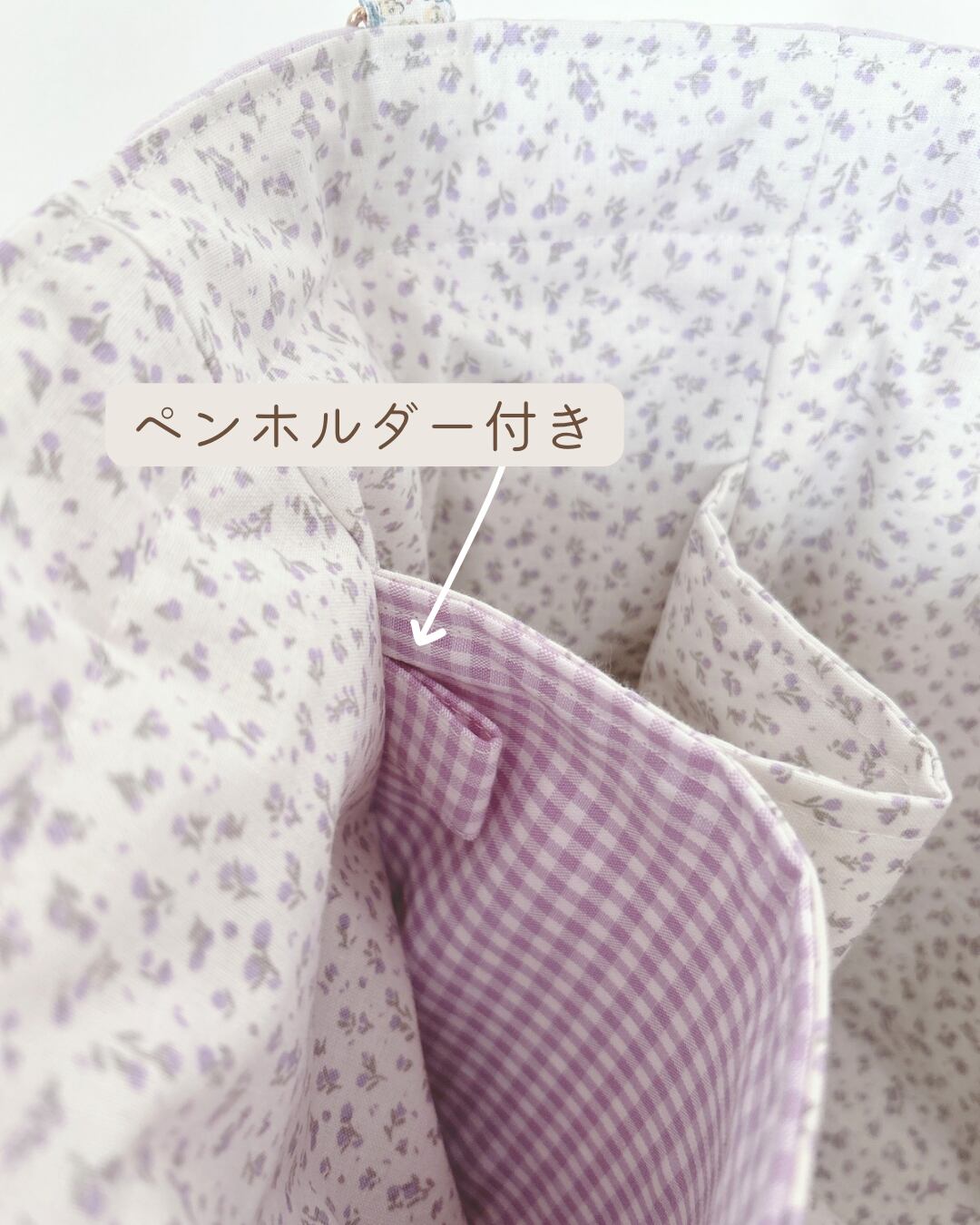 ・内ポケット3ヶ所:外側(防水コットン)、内側紫のチェック柄(コットン)